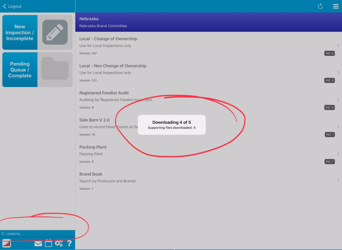 1. Click New Inspection/Incomplete: it will start downloading the updates. Even after the message in the center of the screen completes you need to watch the message in the lower left corner.