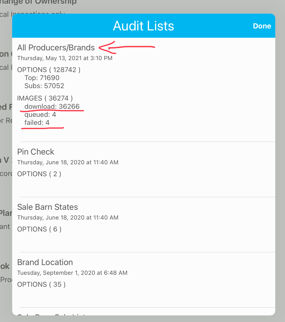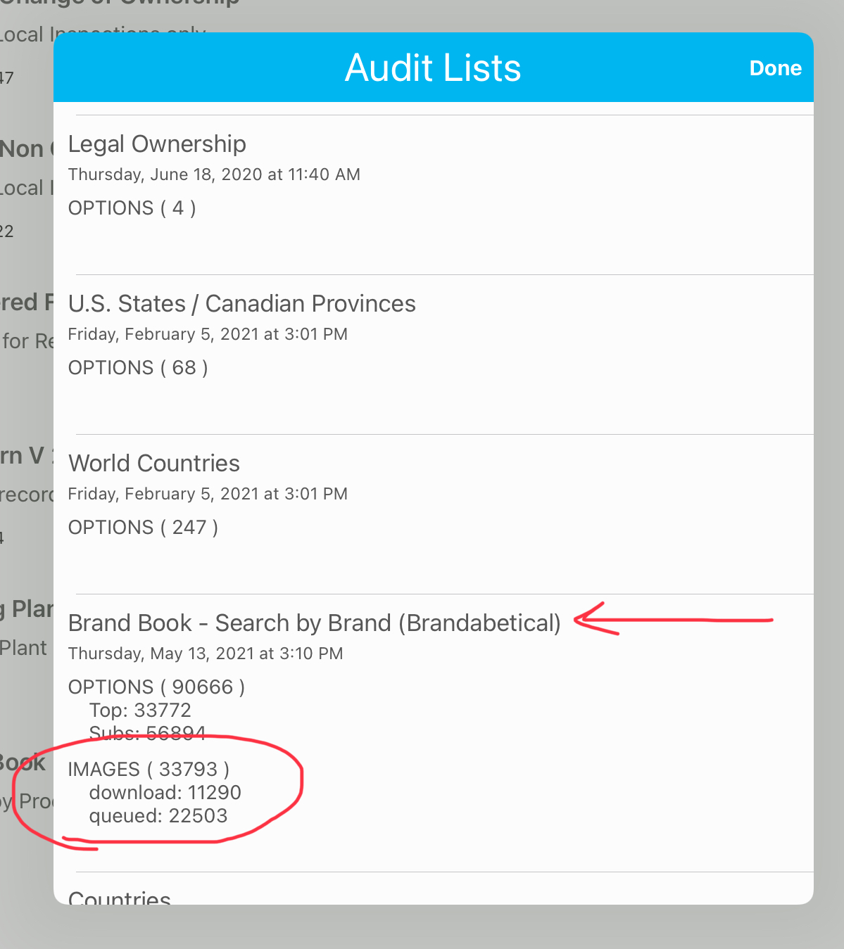 The other List to watch is the Brand Book. It should have close to the 35,000+ images as well in the download line. In this instance you can see its still downloading however as there are still 22,000+ queued up. If you click on the section or click "Done" and come back into the screen it will refresh the number. That will give you an idea of how lonf=g it will take for the rest of the data points to come in.